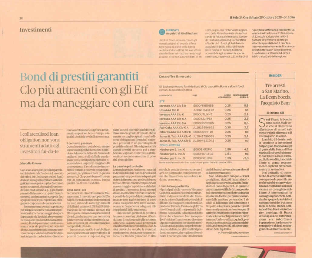 Nell’intervista a Il Sole 24 Ore, il dr. Vincenzo Cagnetta, consulente e analista finanziario indipendente di Studio Enca, analizza il mercato dei prestiti garantiti, evidenziando come gli ETF rappresentino una soluzione più efficiente per accedere a questa asset class grazie a maggiore diversificazione, liquidità e trasparenza.