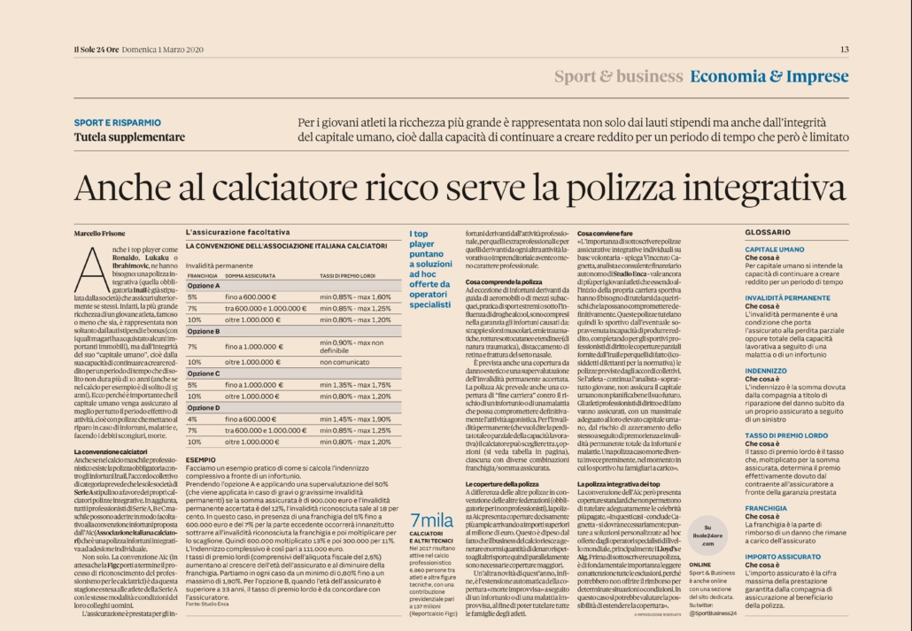 Anche i top player come Ronaldo, Lukaku o Ibrahimovic ne hanno bisogno: una polizza integrativa (quella obbligatoria Inail è già stipulata dalla società) che assicuri ulteriormente se stessi. Infatti, la più grande ricchezza di un giovane atleta, famoso o meno che sia, è rappresentata non soltanto dai lauti stipendi e bonus (con i quali magari ha acquistato alcuni importanti immobili), ma dall’integrità del suo “capitale umano”, cioè dalla sua capacità di continuare a creare reddito per un periodo di tempo che di solito non dura più di dieci anni (anche se nel calcio, per esempio, è di solito di quindici anni). Ecco perché è importante che il capitale umano venga assicurato al meglio per tutto il periodo effettivo di attività, cioè con polizze che mettano al riparo in caso di infortuni, malattie e, facendo i debiti scongiuri, morte.