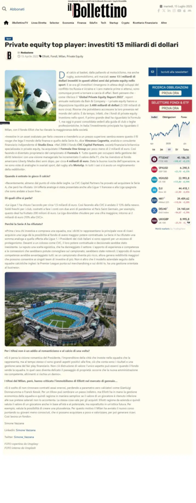 Il Dr. Vincenzo Cagnetta consulente ed analista finanziario indipendente di Studio Enca, intervistato dalla rivista “Il Bollettino” fondata nel 1876 da Ferdinando Bocconi, parla degli investimenti dei Private Equity nel calcio europeo e in particolare in quello italiano.