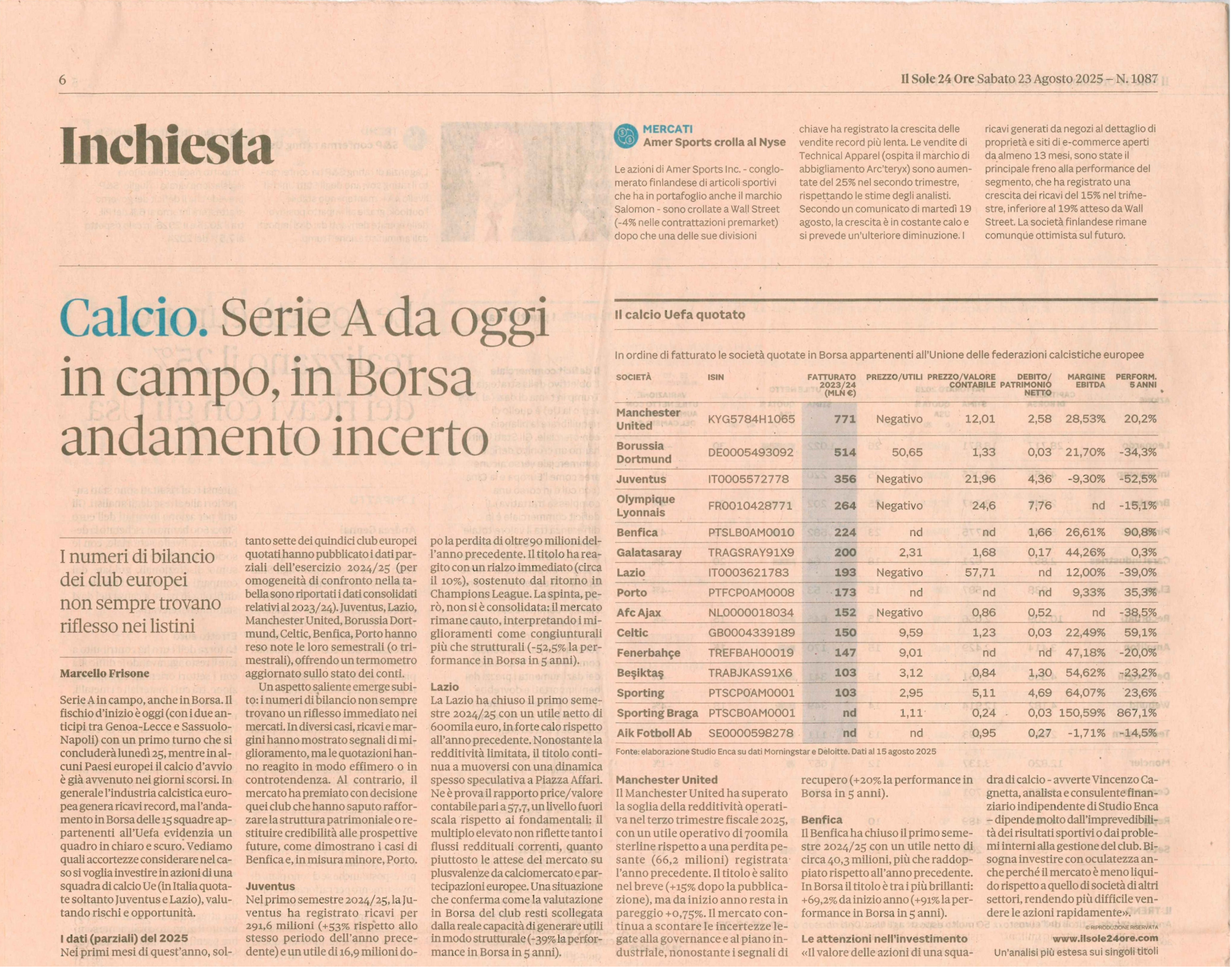 Nell’intervista rilasciata a Il Sole 24 Ore, Vincenzo Cagnetta, consulente e analista finanziario indipendente di Studio Enca, analizza il rapporto tra risultati sportivi, ricavi e andamento in Borsa delle squadre quotate, evidenziando come il valore di questi titoli resti spesso incerto nonostante la crescita del business calcistico europeo.